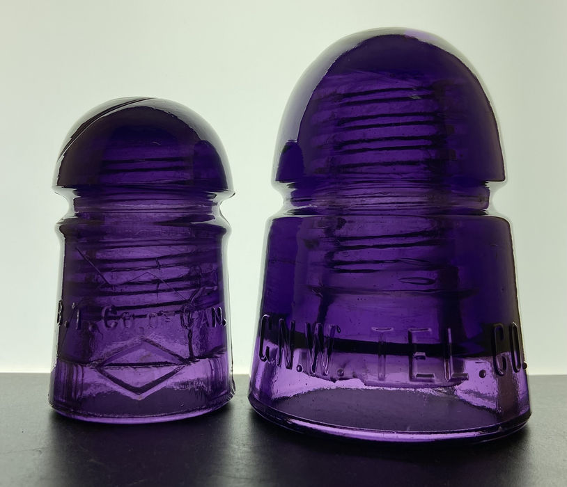 For sale I have 2 beautiful Royal purple Canadian pieces. CD 102 B.T.C EIN [080] Beautiful pony insulator only damage on this little guy is a small pinky nail chip on the base I'm asking $40 shipped for this little guy. CD 145 G.N.W. TEL.CO. EIN [010] Awesome piece this one has a nice milky streak that flows from the fron skirt and really shows up big on the back skirt/dome this one has Small chip on the inner skirt small bb ping on the side of the skirt small chip on the upper side wire ridge and right above that there is 2 more surface skuffs I'm asking 65 shipped for this one. Take both of them for $100 shipped to the USA. I can provide more photos on both these pieces if you want and I take PayPal friends and family please. |