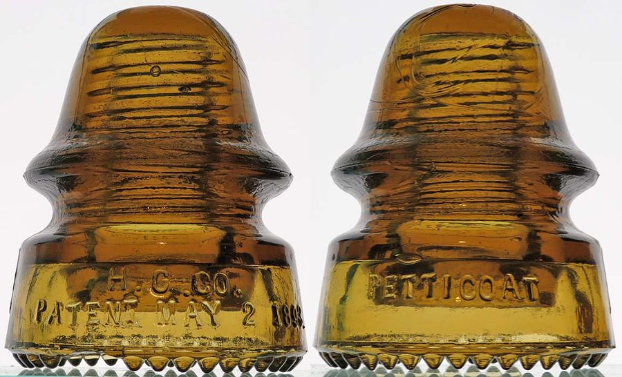 CD 162 H.G.CO. / PATENT MAY 2 1893 // PETTICOAT -- SDP -- beautiful honey or golden amber! -- 3 drips cleanly sheared off below PATENT and one other tiny drip flake -- $195 plus actual postage NOTE: I'm selling these insulators on behalf of the Jim Fielding estate -- PayPal (no fee friends and family) or checks are both accepted - I'll provide instructions. I'll also be handling all the packing and mailing. |