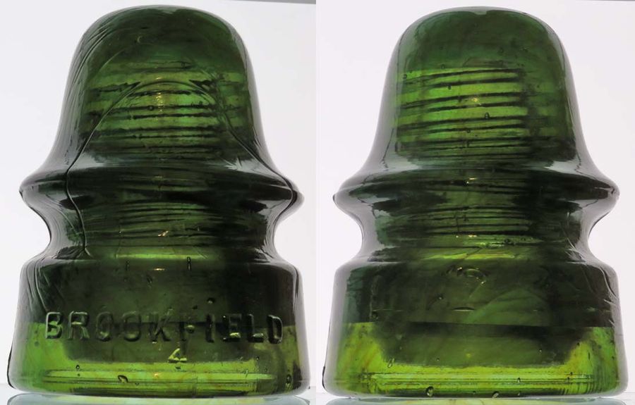 CD 162 BROOKFIELD / 4 {MLOB} -- great deep olive with amber swirling throughout! VNM (just a little roughness around the inner base edge and a 1/4" base annealing line) -- $60 plus actual postage NOTE: I'm selling these insulators on behalf of the Jim Fielding estate -- PayPal (no fee friends and family) or checks are both accepted - I'll provide instructions. I'll also be handling all the packing and mailing. |