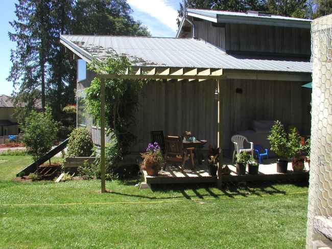 the wife wanted this thing for her (i don't know what the hell its called, its a tree of some sort with long tendrils that take over half the bleedin house each season and i have to hack back every fall) so now the octopus tree can roam freely over the top and be trimmed easily. now what if i were to bolt a bunch of posts (between the two uprights) sideways and fill with insulators???? you will see the results soon! |