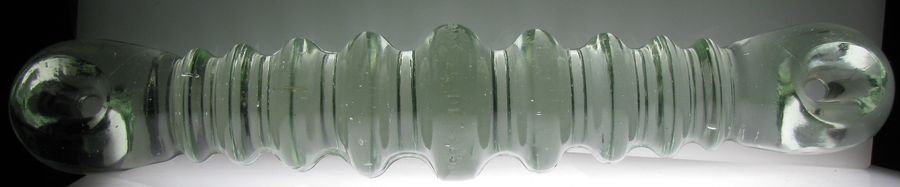 Here's a rarely seen 12 1/2" long Ice Green Pyrex (front) Modele Depose (reverse) embossed radio strain from France. Has 3 bb pings and a few tiny tic marks and small abrasion. Also has a few tiny factory fire bricks and bubbles inside which are rarely seen in pyrex insulators. Factory grind marks affect the top parts of the "SE" in Depose embossing. These bigger ones are much tougher than the medium length examples and the non-clear colors are not often seen. This embossing indicates it is a registered model (similar to our PATENT marking in the U.S.) This cool radio strain can be yours for the reduced price of only $95 plus shipping. Thanks! |