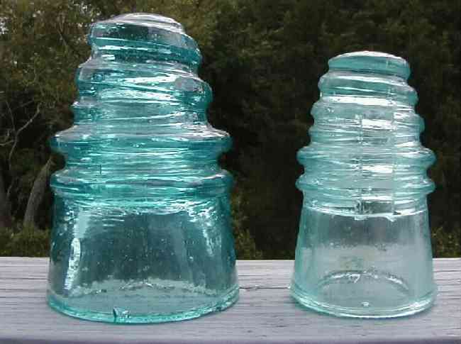 One the left is the "big" brother - CD 110.6. On the right is "little" brother - CD 110.5. Both are base embossed National Insulator CO. A nice pair in any hand !!