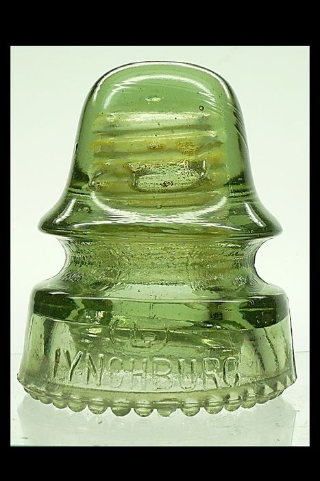 CD 162 LYNCHBURG signal insulator [100] Front skirt: L in an oval / LYNCHBURG Rear skirt: (left) NO. 36 (right) MADE IN / U.S.A. Round drip points. A somewhat smoky sage green Vnm. Has a light base edge bruise behind MADE IN. No glass missing Inside 1/2 of 1 drip chipped. Otherwise nice $50.00 + shipping Stock #a2326 |