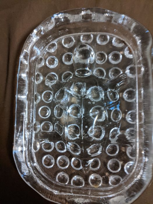 Here is a clear turtle ashtray. It has a raised turtle in the middle. Has glass round bubbles on the base. Uneven sides. Measures approximately 7" by 5" by 1 1/8" thick. Asking $30 plus priority mail.
