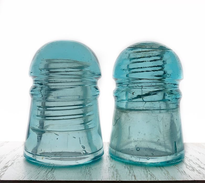 Left piece is no emb. Threaded to base Canadian and right piece is the short thick bar variety does have a small skirt flake as can be seen. Asking 40.00 each shipped or 70.00 for the pair shipped