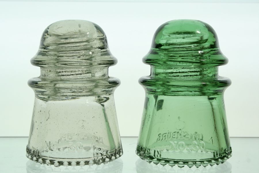 Only yellow green listed under EIN[040], but I purchased this from a collector who specializes in Lynchburg. It still has the "Apple Green" label from him. Lynchburg colors are unique and don't quite cross over to other manufacturers. I photoed the backs to show the blot-outs, not sure if you can see them. The only "damage" is an air bubble right behind "A: in MADE removes a drip point in the apple green. You might find some flea bites. Note: both insulators are just a little darker than the photo. $60 plus shipping for the pair. |