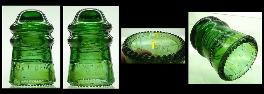 CD 106 HEMINGRAY No 9 pony insulator Front skirt embossed: HEMINGRAY Rear skirt embossed: No 9 Yellow green with amber streaks Sharp drip points. 1 drip chipped associated with a small clamshell flake on the inside of the skirt (SEE PHOTO) 2 other random drips partially chipped A tiny pin prick on the dome. Great color and a great display piece. $50.00 + shipping Stock #a2522 |