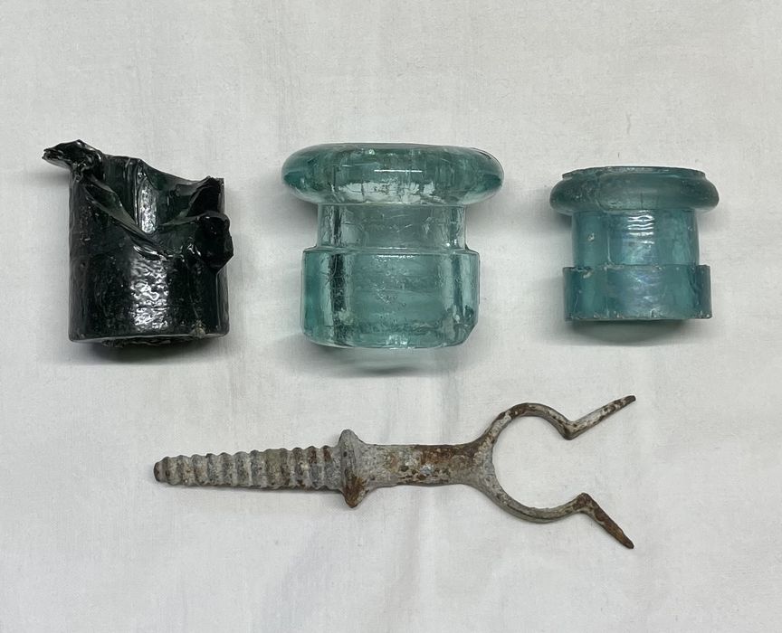 Here's a small group of lightning rod insulators and one bracket I've had around for years. These don't really fit my collection any more and may be in better hands with someone else. I found the badly broken tealy side tab example at left in a dump behind an early general store in a little town called Napier, ON back in the mid 2000s. The centre example is a common aqua piece that has a 1 1/4" base flake, and the early oddball one at right came from a bottle collector who found it in a dump here in London, Ontario years ago - it has a few lower edge flakes, including one 3/8" wide that runs from the base to the wire groove. I dug the bracket in a bottle dump in Strathroy, Ontario well over a decade ago. I'm asking $15 USD plus shipping for the set. I'm always happy to trade for early Canadian glass or Canadian-made porcelain insulators. I accept PayPal, or personal cheque from any member of ICON or any collector with whom I have dealt before. Please feel free to contact me with any questions or for more photos, and look through my other items or unsold sales stock to combine shipping on items. |