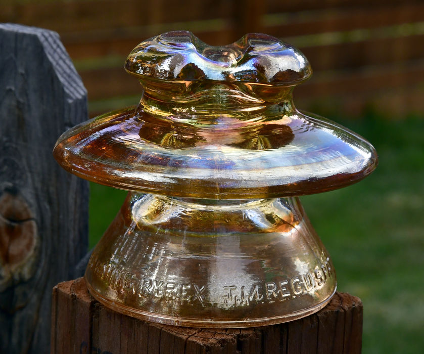 Nice bright carnival CD 320 Pyrex 171. Has a small flat chip on the underside edge of the umbrella. Rest of insulator perfect. Excellent display. Asking $55 plus shipping. Now $50!! Now $45!!