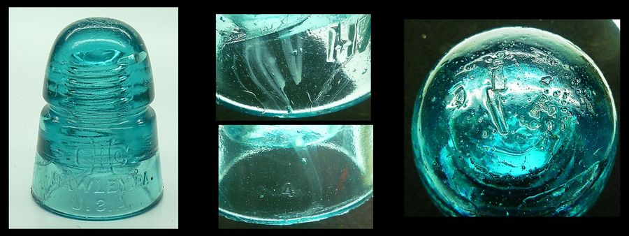 CD 145 HAWLEY telegraph insulator [070] Front skirt embossed: " HARLOE logo " / HAWLEY, PA. / U.S.A. (note the S is backwards ) Rear skirt embossed: small " 4 " near the base Smooth base. Blue aqua with some wisps of milk in skirt front and back. Top of dome is rough where spall glass fragments fell into mold There is a small lehr kiss on the edges of the wire groove in the rear. Overall a nice vnm piece with no major distractions. $20บบ + shipping Stock #a2478 |