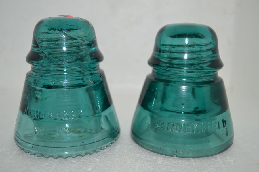 Listed is a pair of CD 157'S on embossed Hemingray 38 and on rear skirt Patent May 2 1893 with sharp drips. Only damage I see is a small scratch under lover wire rim and one drip missing - The other is embossed Brookfield - appears mint. Asking $70 for the pair plus actual postage. |