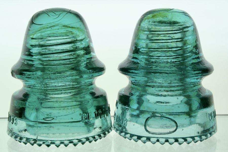 Both are EIN070 H.G.CO. / PATENT MAY 2 1893 SDP LEFT: This insulator is a little darker in the base color; green aqua. There is some nice amber mostly over the pin hole. There are three individual drips that have been sliced off or split very cleanly. There is a dome flea bite and a half inch long clean chip to the upper WG above 1893. $40 plus shipping RIGHT: This insulator also has some nice amber over the pin hole additionally there is a nice skirt bubble just under an inch long. The only damage is two under-poured drips and two nicks to the petticoat and a nick to the out edge of the base. NOW $50 plus shipping |