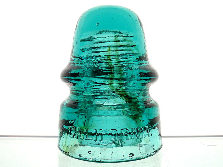 Nice amber in this aqua CD 161 CALIFORNIA. Two needle point ticks and a baby pinky nail inner skirt almost open bubble are the only flaws. $ 90.00 includes shipping.