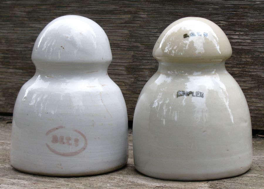 Here's an unlisted porcelain insulator from Brazil (left in the photo). Stamped D.C.T.2 in a pink circle. Quite crude with numerous tiny glaze bubbles (especially in the inner skirt). Measures 4 1/2" base x 3 1/2" tall. Excellent condition with a couple of light use scratches. First email gets this unlisted (in books and NIA website) porcelain insulator for only $50 shipped. Thanks! |