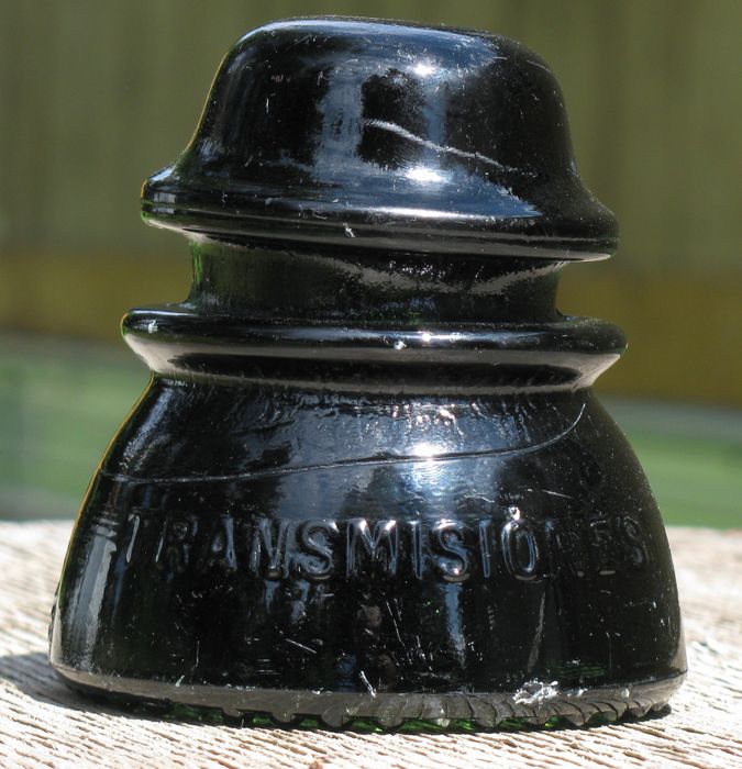 Here's a hard to find CD 154 Asturias (front) Transmisiones (reverse) in Emerald Green Blackglass! Has large dimple in the top of the pinhole. These were used during the Spanish Civil war in 1936-39 to replace damaged insulators in the small region of Asturias. Most were ruined in the war. The glass used to produce these in wartime conditions was not carefully made. Thus they have annealing cracks and lines on the surface, especially around the drip points (similar to those made by Denver glass insulators). Base chip removes several drip points, a 1 3/4" skirt clamshell bruise [id=664817681], a tiny bb dome ping and a few tiny tic marks and 2 other drips with slices. This is my last one of these and despite the damage it displays great and has a cool lean to the dome not found in any of the others. First email gets this scarce insulator for only $100 shipped U.S. Thanks! |