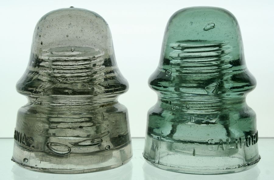 Both insulators are NM, I don't see any damage on the smoky peach. There is a ¼ crack in the inner petticoat of the sage green; facing the camera. There might be a flea bite or nick or two on either of them. Both have an over-pour around the outer edge of the base and there is some roughness (light chipping) in both cases to that over-pour. Left: Smoky Peach CD 162 – there are two nice skirt bubbles that to me look like eyes. See joke photo for diagram. There is just a tint of orange to the insulator; thus the price guide names it peach. $70 plus shipping. Right: Sage green CD 161- There are three small bubbles that face the camera. $10 plus shipping. SOLD |