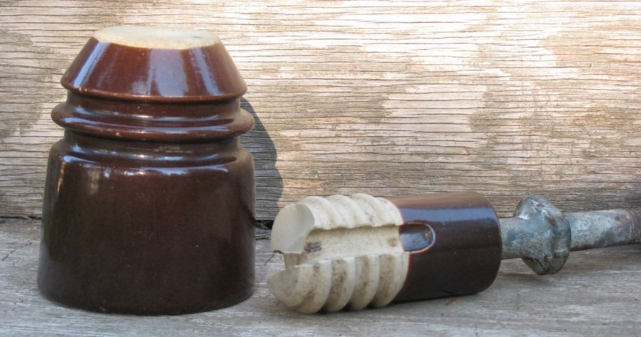 Here's a rarely seen or offered U-1929 porcelain two piece dryspot insulator from New Zealand. The porcelain pin has a canal channel that goes over it, providing a spot for the wire to be held protecting it from moisture (how it gets the name dryspot). Has some wear on the inside threading and a chip on the right top side of the inner porcelain pin (seen in pics) and 3 tiny glaze tic marks. Dome embossed: NZI A. First email gets this scarce dryspot patterned after the early Sinclair Aiken patent from England for the reduced price of only $260 shipped. Thanks! |