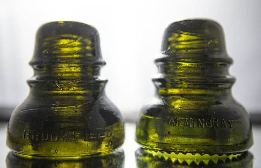 The insulator on the right is a Dark Amber Hemingray No.40 [040]. It has a chip on base (see photo] My asking price is $20.00 + the actual shipping cost.