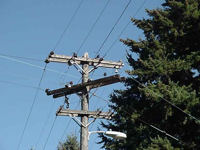 I found this line in Parkland, WA. A lot of the customers have been switched over to the new underground service in the area but these old 4 kV poles still remain. Most of them are still energized and do serve customers in a few spots where the underground service has not been installed. This pole is interesting. There is a three phase line branching off to the left and a single phase line use to go to the right but is now disconnected. Note the top crossarm. The wires continuing on down the line are cut and bent back. Everything from this pole on is dead and in some places the transformers have been removed leaving the fuse cutout and open wire secondary. |