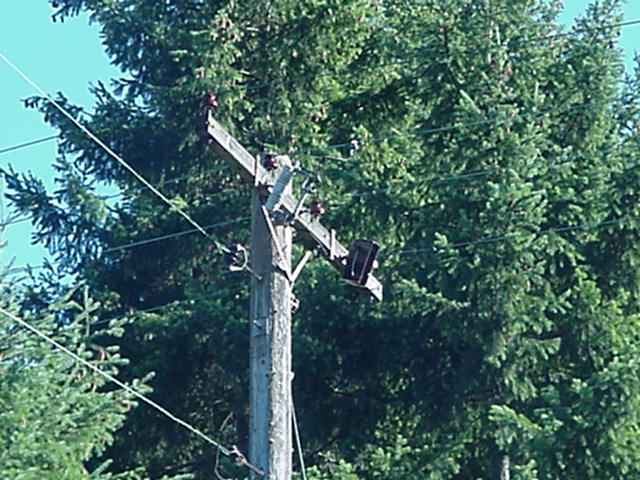 This pole has a single phase branch line going off to the left. Feeds down a dead end street. Use to feed off to the right. Note the new cutout for the branch still in use.