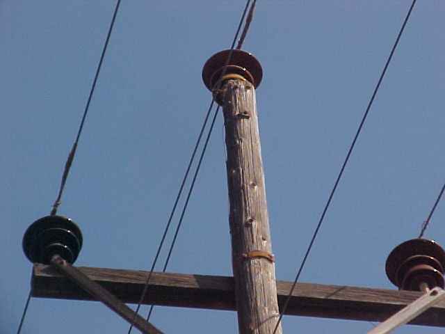 A better look at these items, older type construction with two thru-bolts in the cross arm, braces attached to bolts that hold the insulators in place.