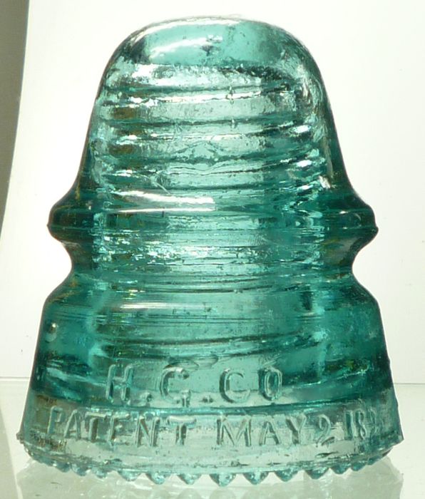 CD 160 H.G. CO. / PATENT MAY 2 1893 baby signal insulator [060] Front skirt embossed: H.G. CO. / PATENT MAY 2 1893 ( NOTE "transition embossing" ) Rear skirt embossed: PETTICOAT Aqua Sharp drip points: 37 total....ALL INTACT !!!!! Vnm overall condition. Small peck on upper wire rim in rear Stock #a3415 $20.00 + shipping |