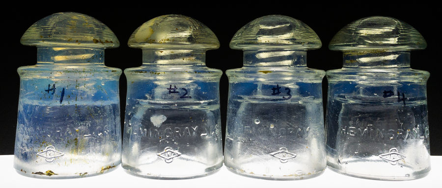 I would consider all of these CD 128 HEMINGRAY's to be in the realm between Light Opalescent and Opalescent. I have them numbered 1 to 4 going from left to right, so please specify which number you are interested in. #1 - EIN[010] in the darkest opalescent of the four. This piece is in very nice condition. The most major is an internal stress line about 1/2 inch long runs from the pinhole outwards under the lower wire ridge area. There is some minor roughness around the inner skirt mold seam. It has the typical staining, although not near as bad as some can get. $130 plus shipping #2 - EIN[010] this one is a bit lighter than #1, but it has a cotton ball of junk in the glass right above the embossing on the front skirt. This one is also nice, but does have some minor issues. There is a tiny nick of the lower wire ridge on the rear. There is some slight roughness in an area of the base and along some of the sharper mold lines like at the inner skirt. This one also has some staining, with some splotchy stains on the dome. $120 plus shipping #3 - EIN[010] this one is similar to #2. While there is very very minor staining on this piece, it has some areas of light damage. On the rear lower wire ridge there is an impact chip and associated fracture about the size of half a nickel. There is another area of small chips of the rear lower wire ridge. There are several minor pings all around the upper and lower wire ridges. All of the sharper mold seams have some roughness. The glass also has a slight hazy appearance, so with the damage and appearance I wonder if this one rolled in a creek a bit. Anyways, $100 plus shipping #4 - EIN[010] this is the lightest of the four. This one also has very minor staining along with some slight damage. The worse is a couple matchhead flakes of the sharp mold seam along the base/skirt edge. There is also some scattered pings of the wire ridges and other sharp mold seams. Still overall display great and very clean. $85 plus shipping I can provide better pics if needed as well. I prefer PayPal no fee, but will entertain all payment options. I will always combine shipping. I will respond in order of email received. |