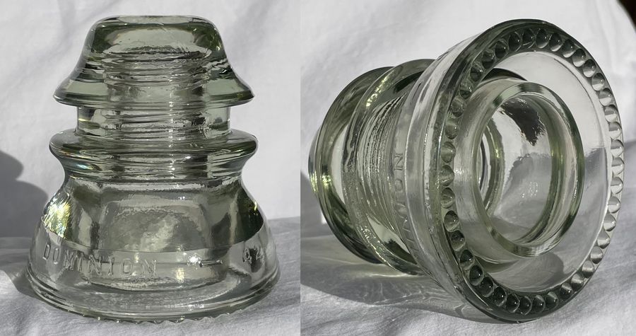 Here's a scarce colour not often encountered in the Dominion 42 CD 154s: a sort of odd, greyish-tinted light yellow green colour. It's a little bit different than the "light yellow green" examples I've come across before in that it's got a little tint of grey. It's also similar to some "gingerale" shades these come in, but is significantly darker and has a lot more green in it. As with some of the other "tweener" colours these come in, I'm not even sure what name to give it. I can safely say this is a very scarce colour variation for anyone trying to complete a lineup of these. This one is the [010] EIN with no mold number on the rear. The photos are taken in natural light, which seems to be best for capturing the exact shade. This example is in absolutely awesome condition, with only a couple absolutely tiny fleabites visible on the wire ridge and some scuffs in the wire groove. I'm now asking $60 USD plus shipping for this oddball. I'm always happy to trade for early Canadian glass or Canadian-made porcelain insulators. I have a long-standing want list of Canadian-made porcelain posted, [id=505519866; please click here to see it]. I accept PayPal, or personal cheque from any member of ICON or any collector with whom I have dealt before. Please feel free to contact me with any questions or for more photos, and look through my other items or unsold sales stock to combine shipping on items. |