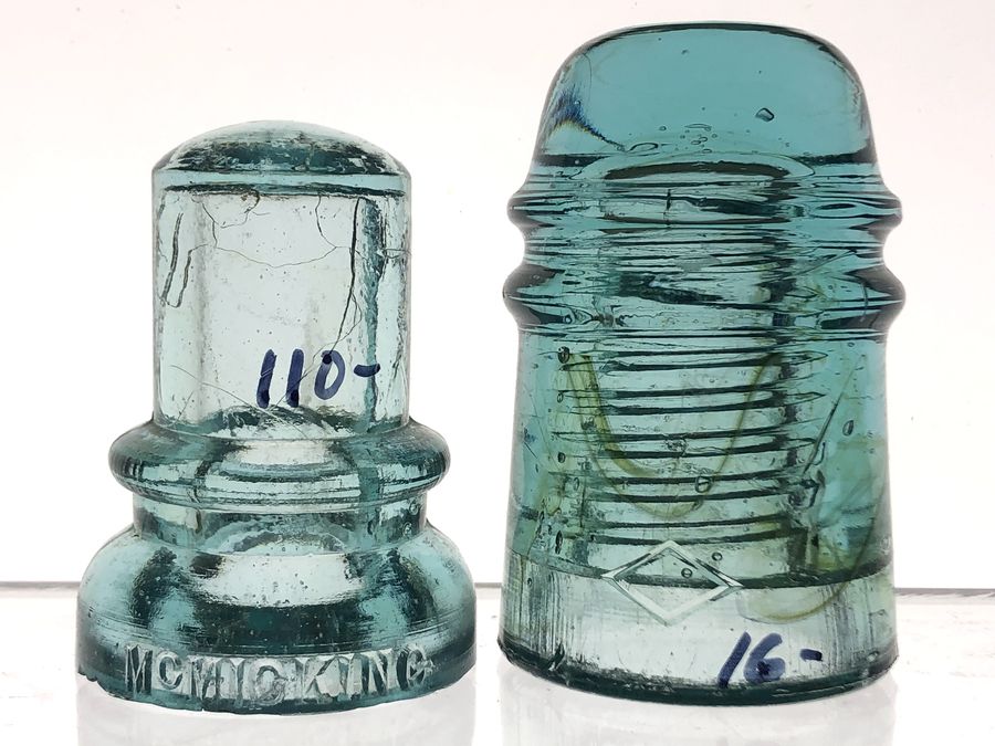 Cd 734 McMicking threadless in very nice shape. Some typical sharp base edge roughness and smaller than pea sized dome edge nick at right mold line. Displays mint from front. You can barely see the nick from the back when embossing is centered. $120 shipped Cd 121 double diamond in aqua w/ nice amber ribbons around half the insulator. Couple flea bites from mint condition. $25 shipped. Take both for $130 shipped |