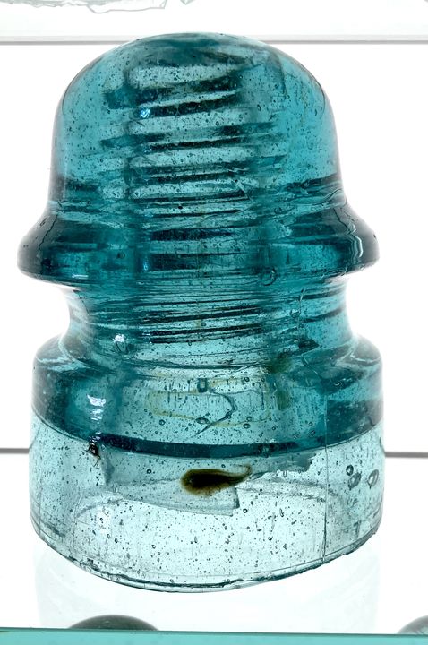 Rarely seen for sale, this is the scarcer mold profile of the consolidated CD 170. Believed to have been made by American Glass Pipe & Plate Co. of Boston, they can be found with very short or very long skirts, and everything in between. This example has a rather long skirt, making a large insulator outright huge ! As is typical for these brutes, this one has a nice, light fizzy glass quality that makes it bright and glowing. The skirt has a glob of olive green goop that looks like a polliwog and stands out against the light blue-aqua glass. This piece has a clean 1.5" inner skirt chip and a pinkynail flake off the underside of the wire ridge. Otherwise, it appears day one excellent. These are prone to bad damage and besides all the great character, it is in exceptional condition for this rare early power piece. $90, shipped in U.S. |