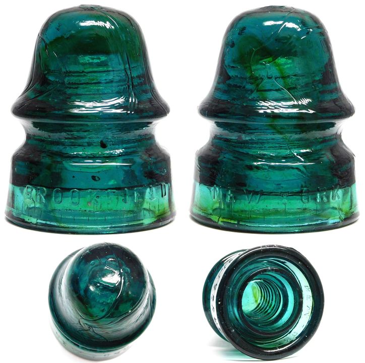 Here is a CD 162 EIN [030] (Dome) 01 (F-Skirt) BROOKFIELD (R-Skirt) NEW YORK SB in dark Teal with Amber swirls mostly in the rear. There's also some light snow and small bubbles throughout, a tiny black pebble in the front wire groove, slight ghosting of the rear embossing, and generous dome glass. I find no damage to report. Asking $25 plus postage. CK/MO. |