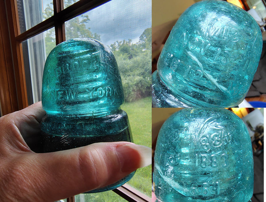 Here is a fizzy blue aqwa CREB beehive. The skirt needs to be cleaned. Unfortunately a crack on the dome. But the ghosting is interesting. Nov 13th is ghosted above the top patent date but then the 1884 from the bottom patent date is ghosted next to it. $30 + shipping. |
