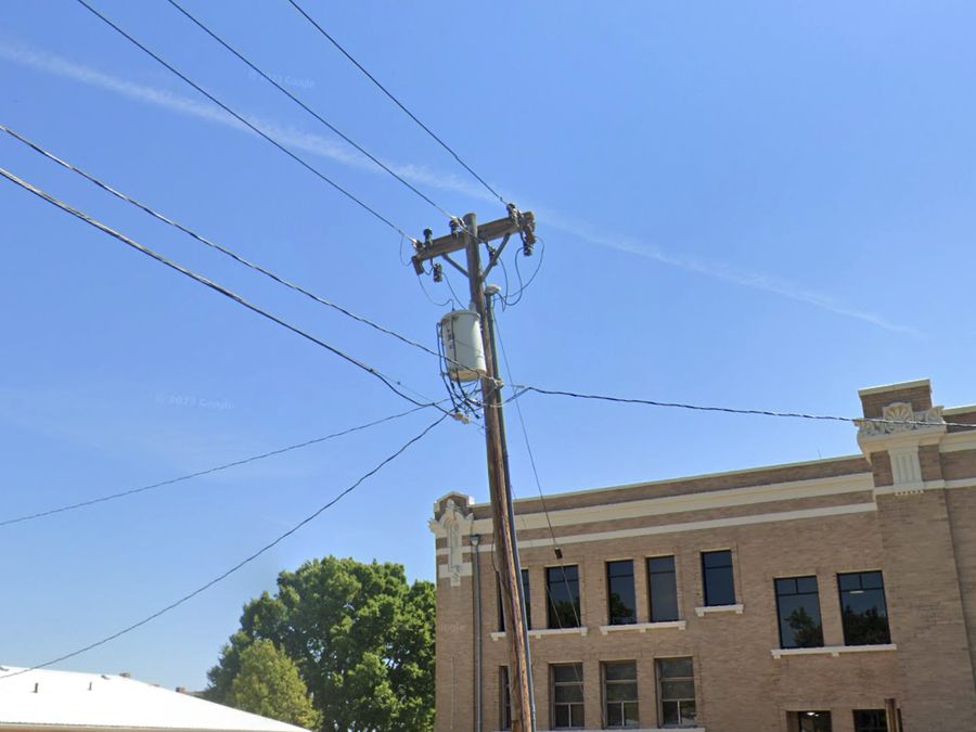 A riser on a municipal 2400V system, shortly before the city replaced it with a modern distribution line, likely operated at 12.47kV. This city was content to upgrade its municipally owned distribution system at a leisurely pace, replacing poles, arms, and insulators until a segment was ready to be switched from the old 2400V corridor to a previously upgraded segment. An unexpected engine failure (and resulting fire in the city power plant) on a bitterly cold day in February prompted the city to make conversion of the remaining 2400V its top priority, intending for completion by the end of June. This riser was for the last major customer to be converted; it is a bit scary to see 2400V primary fed into a typical low-voltage riser pipe! (Credit: Google Maps) |