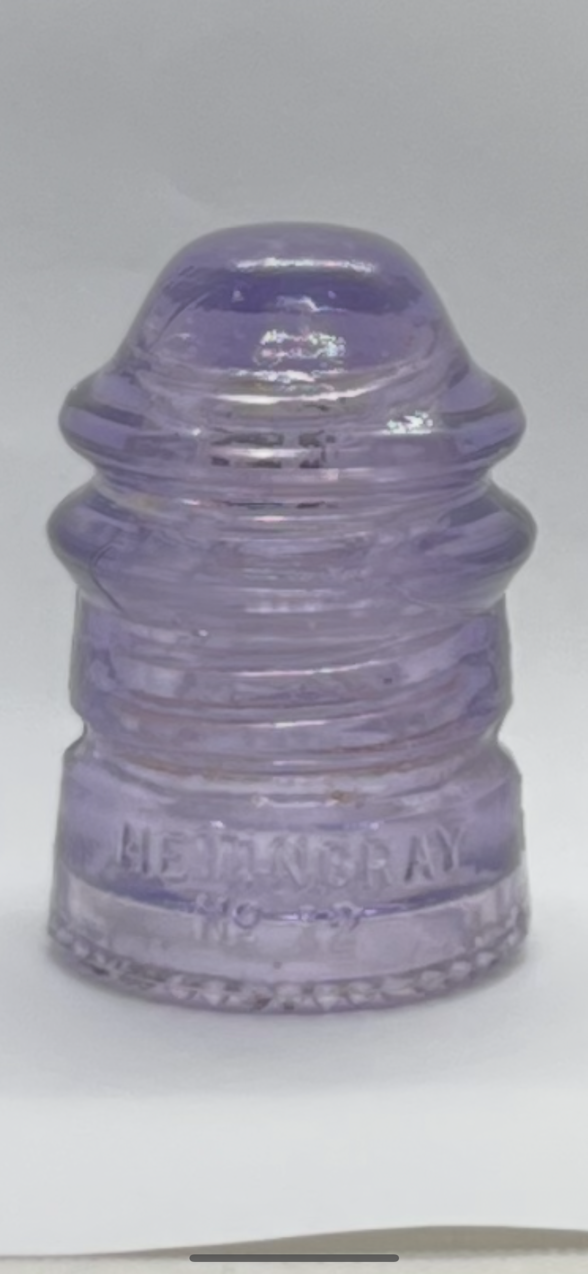 Here is what I call a lavender color CD 113 Hemingray 12 [130]. I had a heck of a time trying to capture the true color on this one. Between outdoors and the light box/cabinet it was very difficult. The picture attached here is the closest I could get. I'll be posting subsequent pictures of the damage and you'll see that the close ups made this one out to be a darker hue and much less vibrant. Overall it's in great shape:a couple flea bites on upper wire ridge, a small match head size flake off lower skirt with the worst damage being the chip under "1893" which removes one entire drop point. About a dozen other drip points do have some form of damage. Price is 250 shipped via PayPal FV/gs add 3.5 percent How about $235 shipped. |