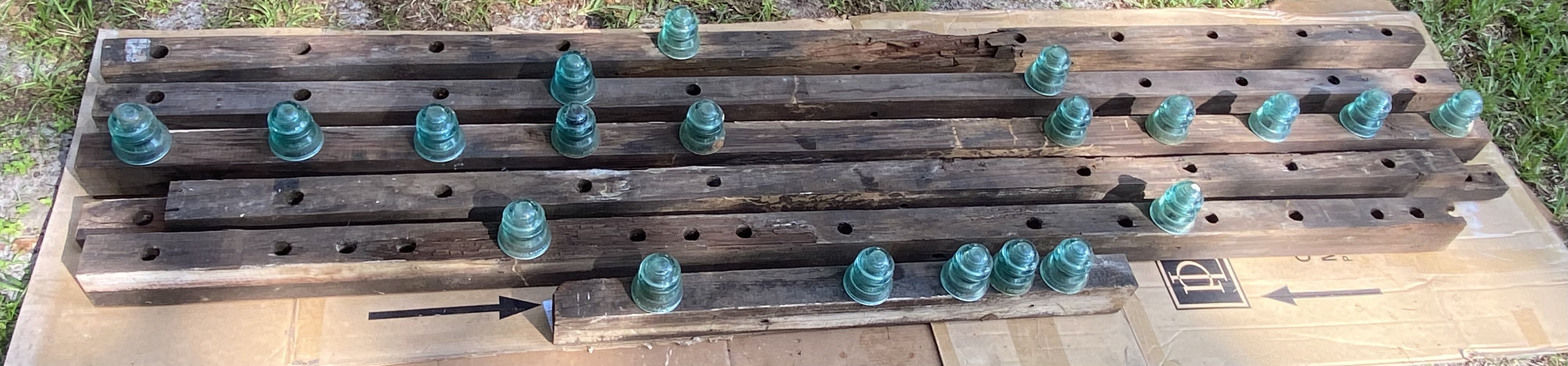 For insulator collectors, what better way to display them than on a vintage crossarm. I have for sale six original crossarms of various lengths that possibly date to the late 1950s. Four of the arms are 10 feet long; one is 9 feet; one is 45 inches. Each crossarm measures 4 inches by 3 ¼ inches, and each has one or two holes on its side for bracing. One of the 10-footers has about an 8-inch notch on each end, for what purpose I don't know. Three of the 10-footers have 10 circular peg holes approximately 1 1/4 inch in diameter; the notched 10-footer has eight holes; the 9-footer has 16 holes; the 45-inch crossarm has five holes. Three of the 10-footers are neatly engraved with the marking "E&R J-59 SPC." I can't decipher its meaning, but wonder if "J-59" might mean January 1959. They appear to have been treated with creosote, which has preserved most of them in very good to excellent condition. BONUS: In addition to the crossarms, buyer gets the 20 Whitall Tatum No. 1's that are shown in the photos. The crossarms are located near Hawthorne in North Central Florida, about 100 miles south of the Georgia line and 125 miles north of Orlando. Can't ship; local pickup only. $350 for all six crossarms and the 20 Whitall Tatums (selling as a lot only).