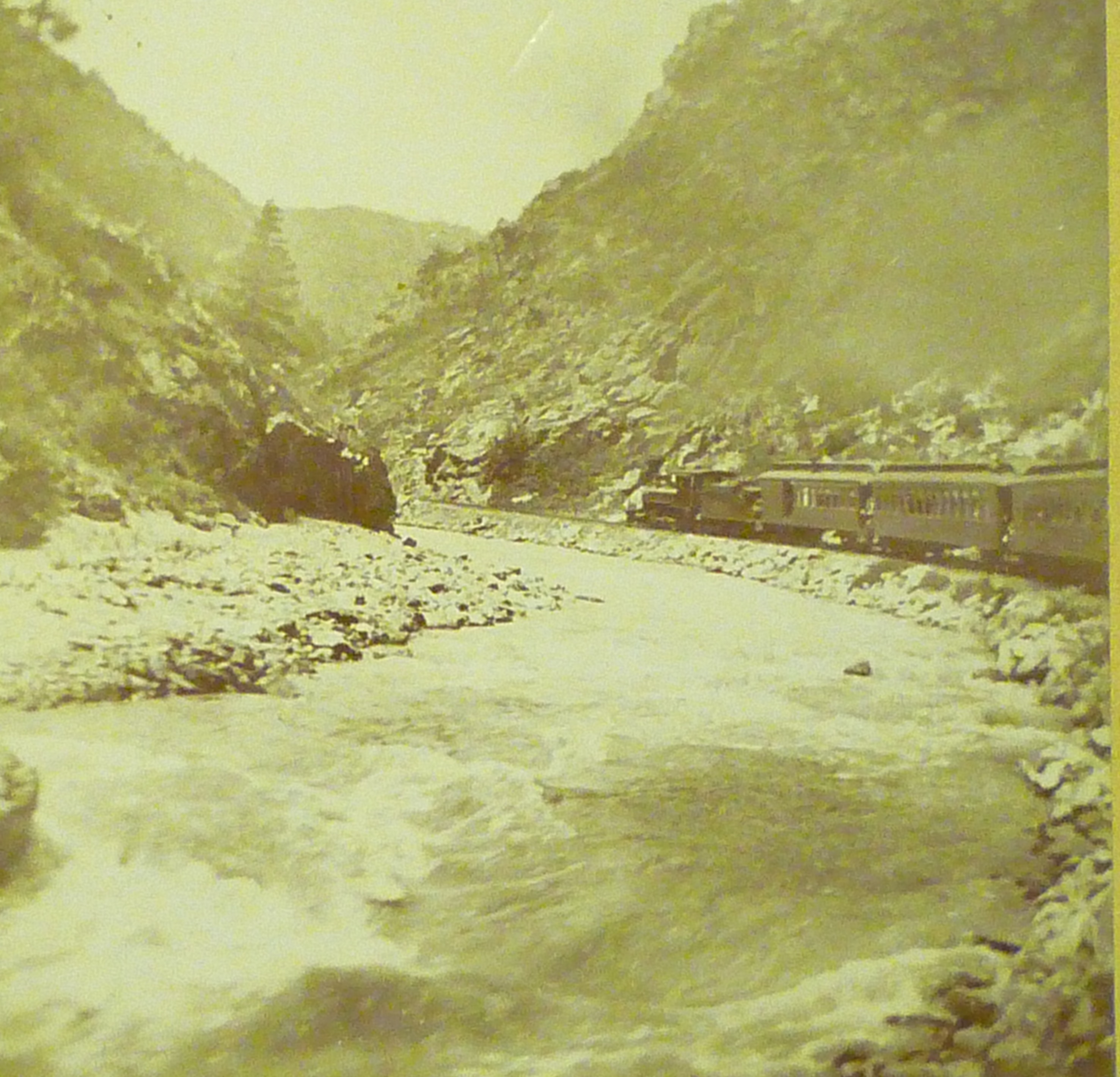 Bought a box of what I call " dead people " photos at the WABASH show Aug 2 just to get this photo. Photo of DENVER & RIO GRAND R.R. in Royal Gorge sometime in the late 1800's. Famous photographic spot that I have seen many times and was there in 1965. This passenger train is heading west along the Colorado River with the consist being pulled by one of the narrow gauge steam locomotives. Photo measures 4" x 4" Original on matte board Photographer: unknown |