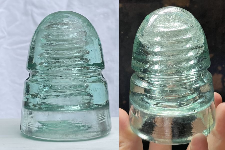 Here's an early Canadian threaded piece that gets overlooked too often: the unembossed "rounded base" CD 143. These are a solid 1880s piece of Canadian telegraph history that did a lot of heavy lifting from coast to coast in its day. For whatever reason they don't seem to garner much of a following in the hobby, which is really unfortunate. Maybe it's because they aren't (easily) found in a wide variety of colours, or maybe it's the fact that they're unembossed? In any case, I think they're just great early pieces of glass. This one is a nice crisp, almost icy light green aqua colour. It has a bit of whittling on the crown, and the best part is the milk, fizz, and carbon swirls around the dome and top of the pinhole that give it a bit of a "halo" when viewed back or underlit. It shows its age of 140ish years well. Despite its age, this one remains in good condition with just a couple small flakes on the usually damaged sharp inner base edge. This one is better than most for that. It also has a few light scuffs in the wire groove and a couple on the skirt. Overall I'd call it VNM as far as these go... or maybe NM as far as the overall hobby would see it. I'm now asking $35 USD plus actual shipping cost for this early character piece. I'm always happy to trade for early Canadian glass or Canadian-made porcelain insulators. I have a long-standing want list of Canadian-made porcelain posted, [id=505519866; please click here to see it]. I accept PayPal, or personal cheque from any member of ICON or any collector with whom I have dealt before. Please feel free to contact me with any questions or for more photos, and look through my other items or unsold sales stock to combine shipping on items. |