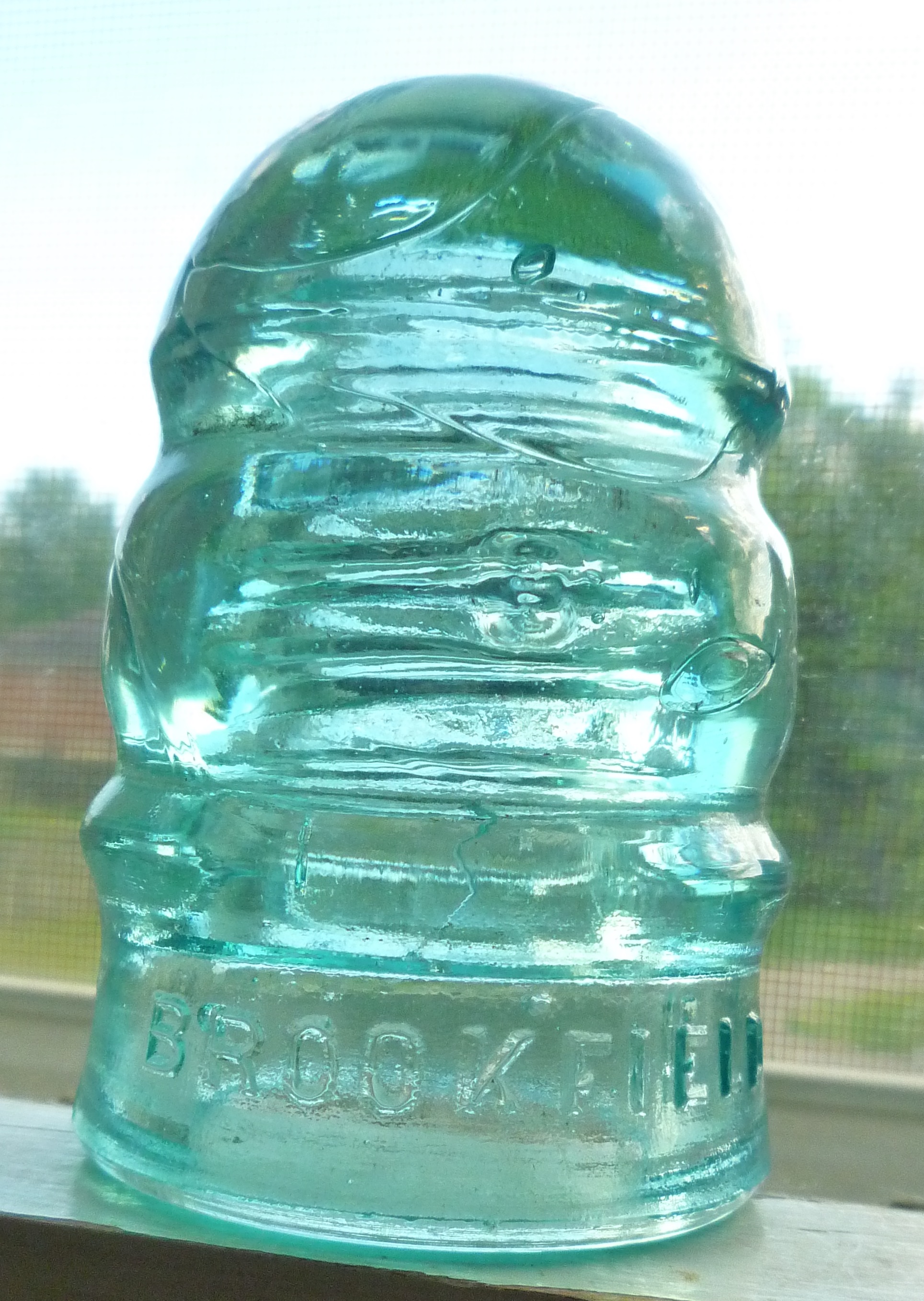 CD 112 B / BROOKFIELD keg type exchange insulator. Has a B embossed in the center / BROOKFIELD which is embossed on the skirt. Rear skirt has NEW YORK embossed. Smooth base. AQUA GLASS. As close to mint as they come with no distractions to note. Stock #a4056 $15.00 + shipping |
