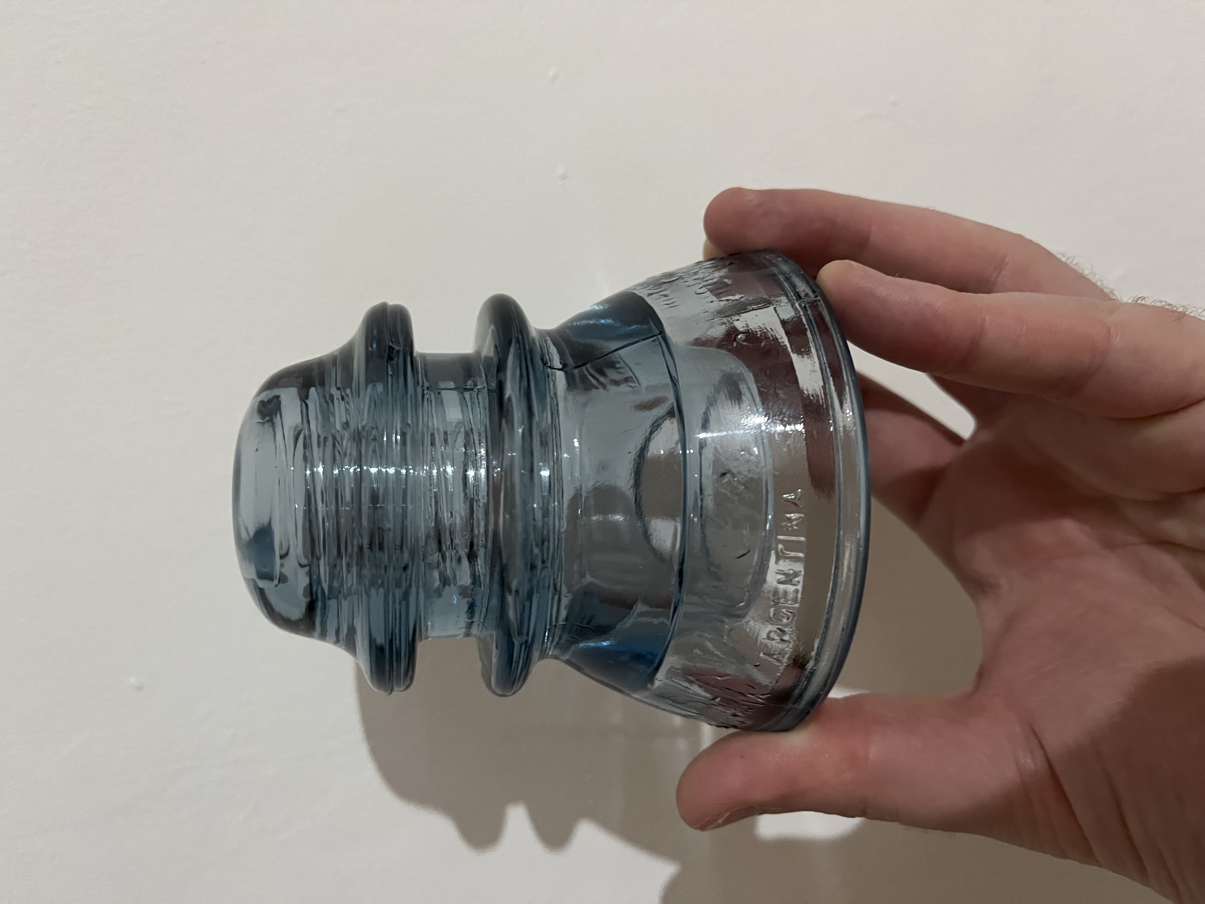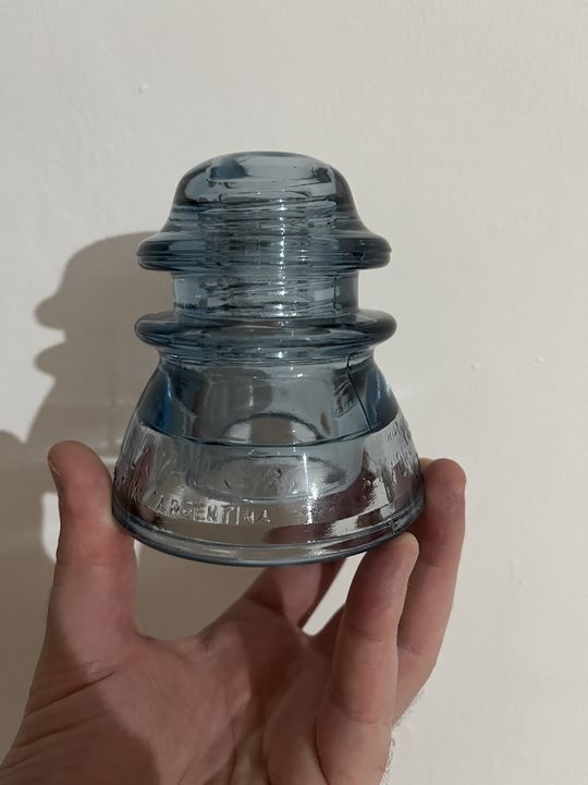 Beautiful cornflower color. I'll say is bluer in person than in pictures. Condition: very good. Little flea bite in the upper groove (I'll happy to show it in a video), and minor scratches around the skirt. The bite is in the mold line so the insulator displays perfect. Mold number 24 (mark in the top inside of the thread) Embossings: aislatron industria Argentina Cristalerías Vidrart SA 17 - entel a17. Price: $100 plus shipping via DHL. (About 50 usd more) Accept PayPal and western union. |