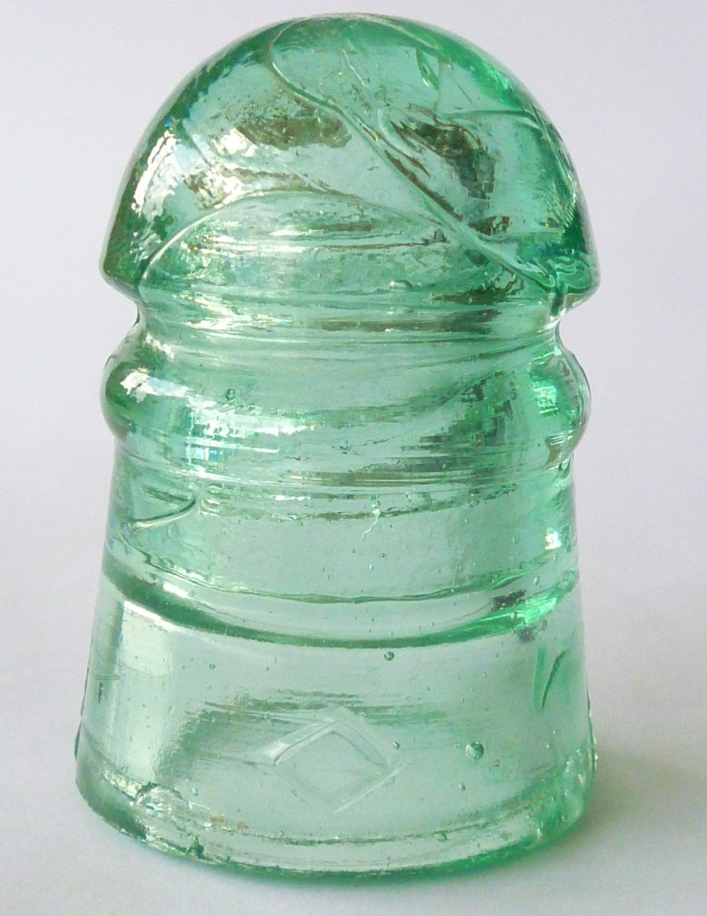CD 102 DIAMOND pony insulator. Smaller diamond with light " speedy " lines. Smooth base. ICE GREEN " . Nice amount of " straw marks " on top of dome. Nice overall condition with no distractions to note.
