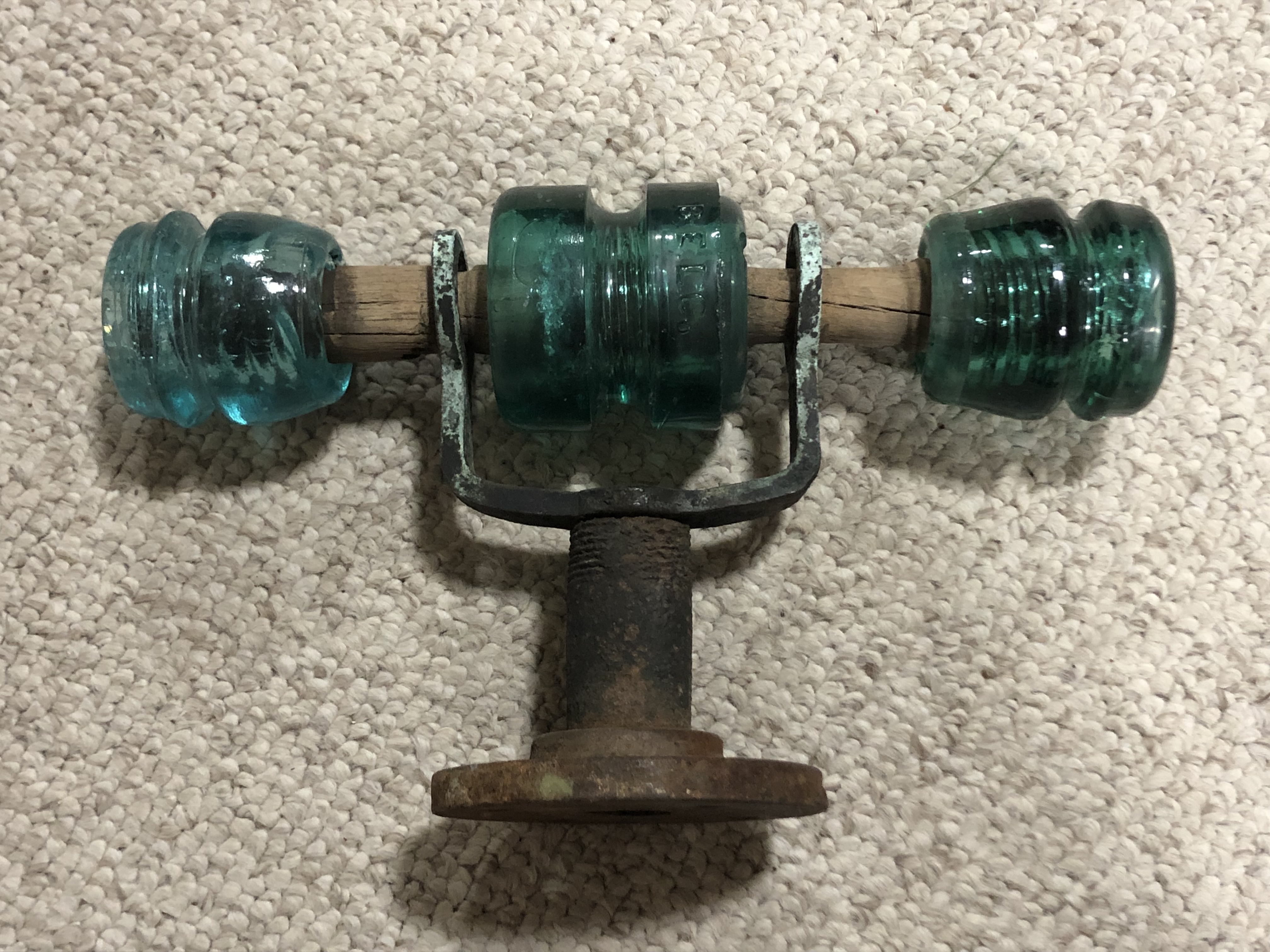 It's time for this museum quality piece to find a new home. I have several pictures for interested buyers. Most likely made by Hemingray as one was dug at the dump without the top punched out. One of two known units as shown. The other is still owned by the original finder. Only two triple drop brackets like this are known. This picture is how I display it. With CD 187's on each end. It was found with CD 164 Brookfield's on each end which will come with the piece. The 187's come with it as well. The BELCo spool is in very nice condition with only some minor roughness and scattered nicks. The wooden pin has three threaded areas and is all one piece with some wear from use and age. I'm asking exactly what I paid for it. $4000. Shipping and insurance additional. Or delivery to the CT swap or Ohio show with prepayment. More pictures available. |
