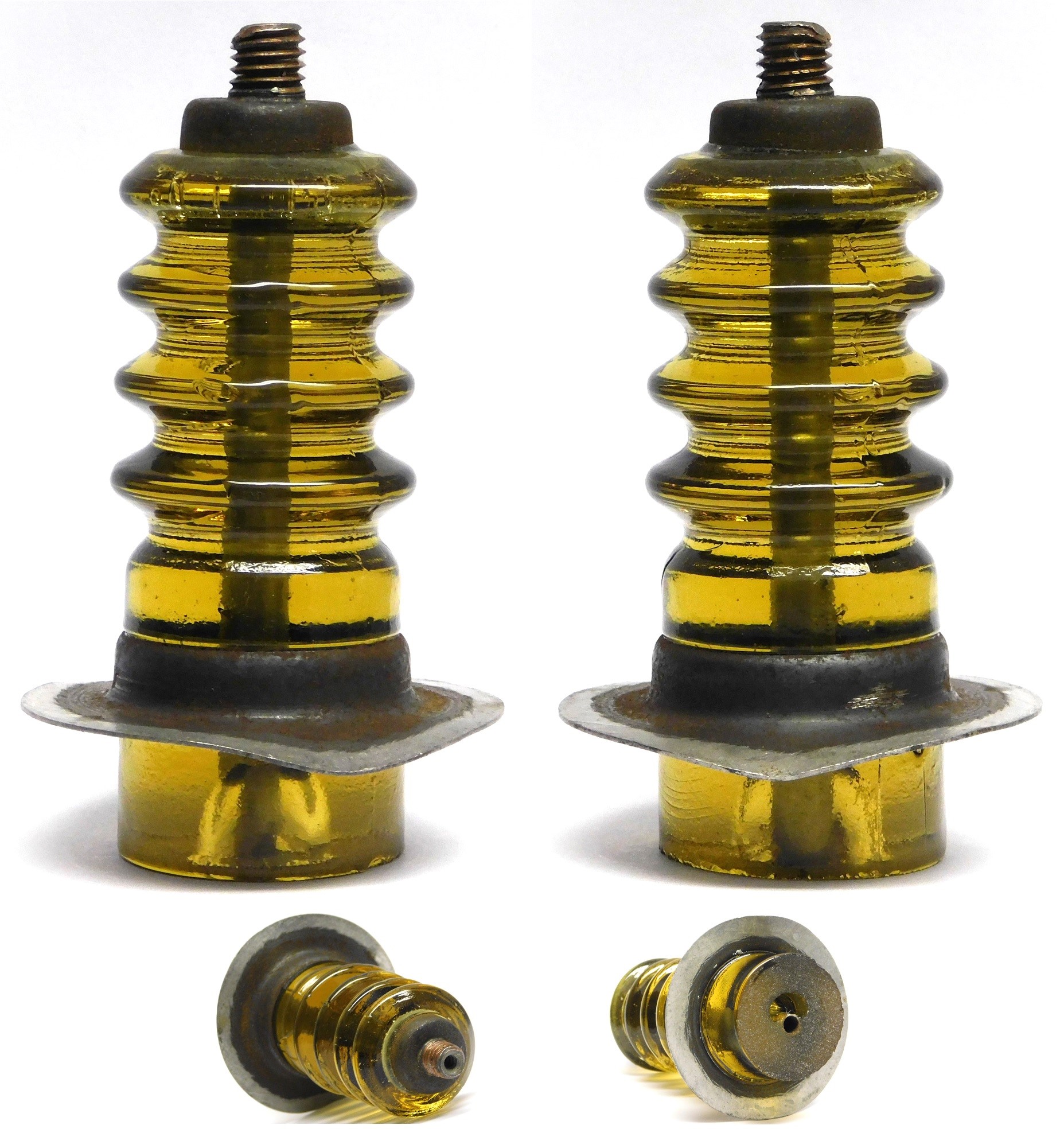 Here is a 4" tall capacitor bushing in Honey Amber. There is an open base bubble, but no other damage to the glass. The metal skirt has two bends in it, and the copper threads at the top are slightly buggered. Asking $145 shipped in the US. CK/MO. |