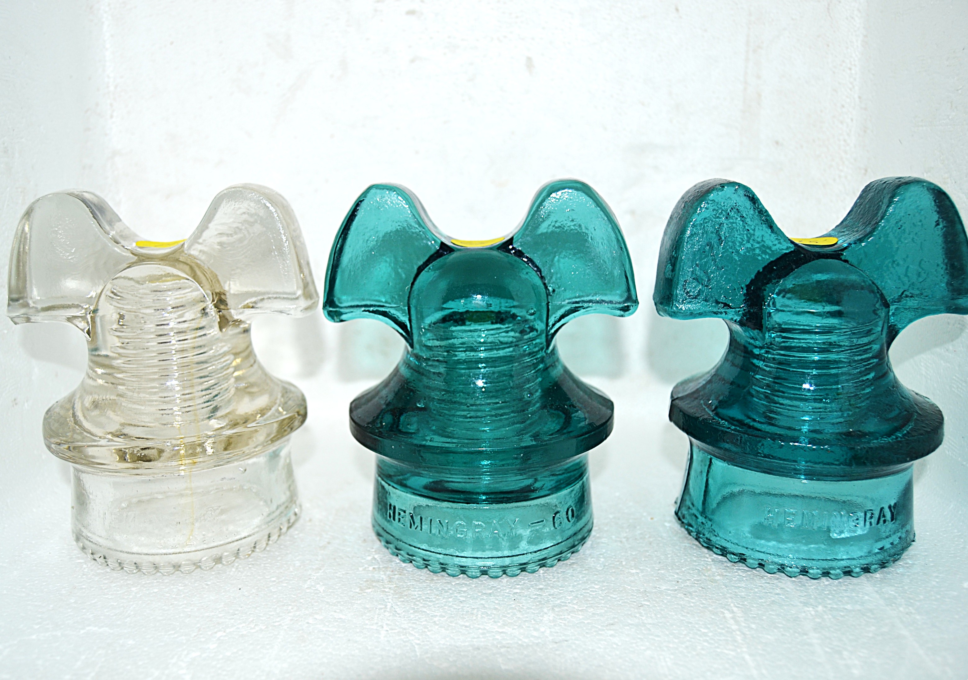 Listed are three CD 257 Hemingray's - Left embossed Hemingray and on rear No 60 - round drips - Clear with straw - One Micro spot on front less than 1/32" and a little roughness on back wire rim - about 1/2 inch. $40 -- Middle Hemingray 60 and on rear Made in U.S.A. - Hemingray blue - Round drips - One pit stone on back that is partially open - Less than 1/8 inch. $65 -- Right Hemingray Made in U.S.A. No 60 - Round drips - A darker shade of Hemingray Blue - Call it VNM - see no flaws - $75 plus shipping. |