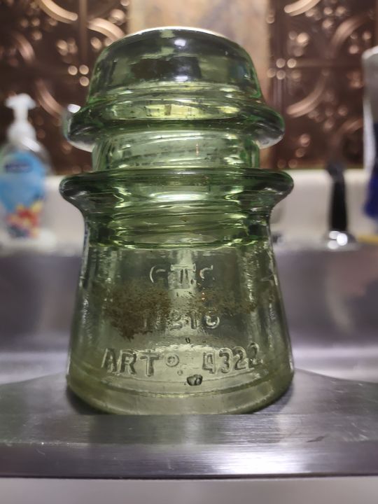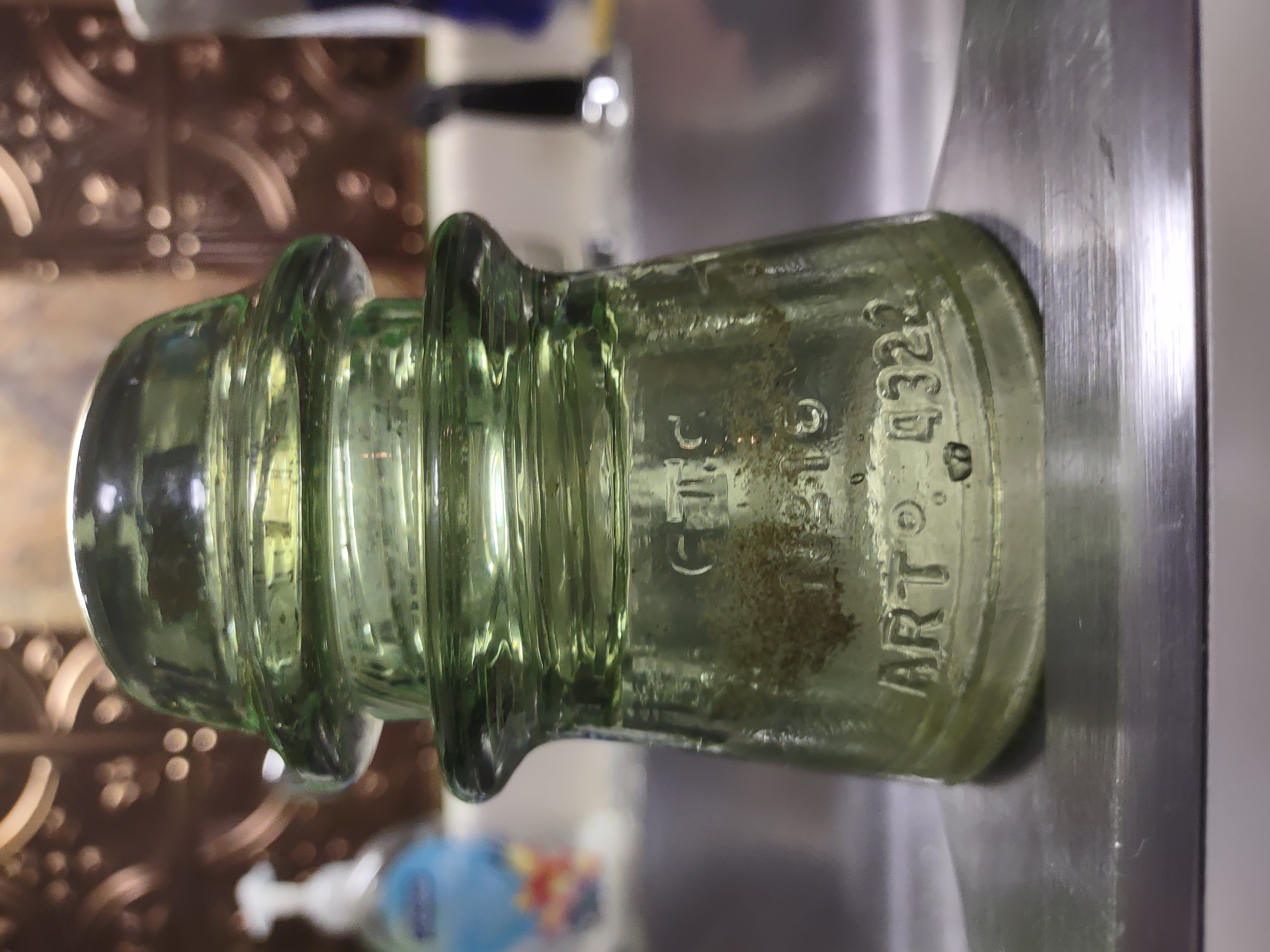 1st - green glass SOLD has a couple flea bites, $100 shipped. 2nd - white porcelain with wood pin, one flake inner skirt. 3rd - brown porcelain with "cemented" pin.