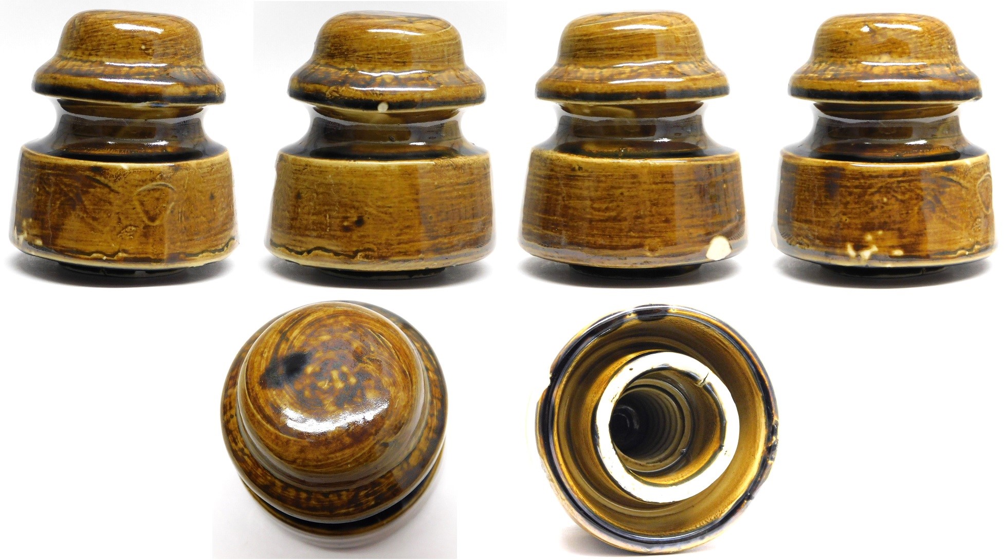 Here is a porcelain insulator that I am unable to identify in the current Price Guide. It measures 3-3/8" across and 3-½" tall. The glaze is an uneven Caramel, and there appear to be brush strokes across the inner and outer skirts and sides of the crown with swirling on top of the dome. The photos show the view from all sides. As can be seen, there is a small flake on the wire ridge and a pinky nail flake on the outer skirt. There is also a small annealing line on the inner skirt. Asking $40 shipped in the U.S. oddity. CK/MO. |