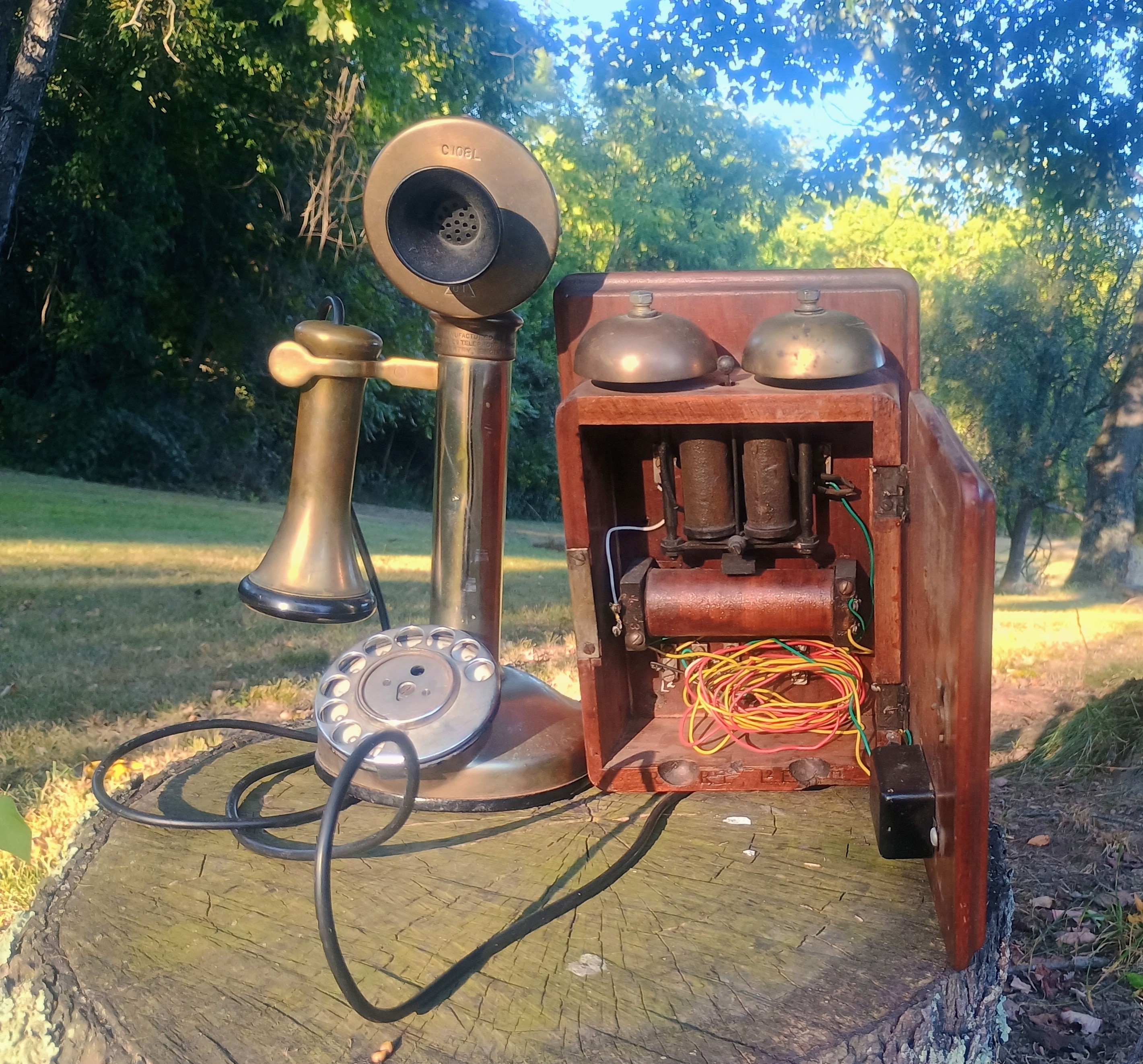 Vintage brass and chrome GE embossed candle stick phone. Everything looks to be original except for the cord from box to phone and base to mouthpiece. Box electrical components appear to all be there and original. You could probably make this work again. Original wiring diagram on the inside of the door and the walnut housing is in perfect original condition. Embossing on the phone neck is: Manufactured by the G E. Co Telephone Works, Coventry, England. I have done nothing to this to polish anything up. All original patina. I do believe that there was a bakelite insert that was in the middle of the rotary dial that is gone. More pictures on your request. Asking $195 and I'll hand it to you at the Springfield Ohio show in person. |