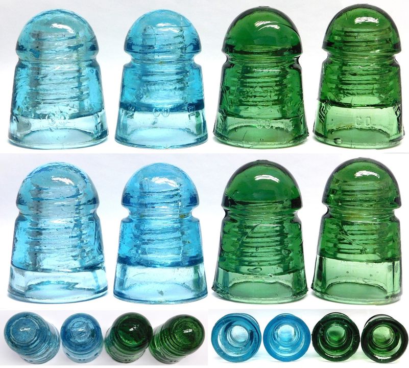 Here are four CD 104 NET&T's in VNM condition or better: On the left is EIN [100] (F-Skirt) (Arc)ИEW EИG.TEL & TEL. {Backwards 'N's}/CO. SB in Aqua. There is a pinpoint peck on the dome. Asking $25 shipped in the U.S. CK/MO. Second from left is EIN [060] (F-Skirt) (Arc)NEW ENG.TEL & TEL./CO. (R-Skirt) [Oval slug] (Base) NATIONAL INSULATOR CO./PAT.JAN 1.& OCT.7.1884 BE in Blue Aqua. There are two tiny base edge flakes in front that do not affect the embossing and a shallow base sliver in the rear that takes out NATIONA. There is a white pebble in the rear skirt directly above the sliver. Asking $375 shipped in the U.S. --SOLD-- Next is EIN [010] (Dome) [Backwards] 5 (F-Skirt) (Arc)NEW ENG.TEL & TEL./CO. SB in deep Yellow Green (the photo doesn't do the color justice). There is a tiny ding to the rear crown and light nibbling to the overpoured flashing around the base. Massive dome glass, several small bubbles, and a white pebble add to the character. Asking $70 shipped in the U.S. --SOLD-- On the right is another EIN [010] with a backward 7 on the dome. The color is Olive Green. There is a peck on the front crown, surface scratches on the rear crown, a tiny flake on the wire ridge at the right mild line, and annealing lines run from the rear crown into the front skirt. Asking $75 shipped in the U.S. CK/MO. |