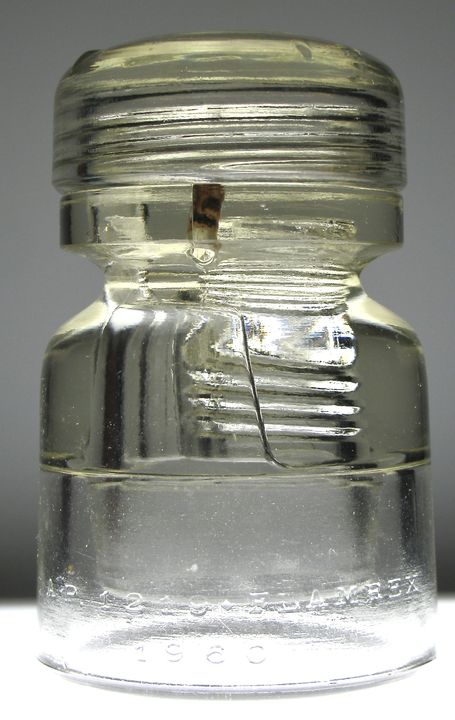 Here's a desirable two-piece Light Yellow CD 402 glass dryspot insulator from Italy. The cap unscrews to allow a wire to be inserted through a separate hole to prevent leakage. Embossed: CAP 1219 . FLAMREX 1960 (front) TS (rev). These are rarely offered and this one easily grades VNM+ condition! No chips or cracks! Only 2 pinpoint tic mark and some very minor roughness on the first thread under the cap! First email gets this hard to find insulator. (This cd books for $300-350!) Priced to fly at only $100 shipped! No need to pay auction prices or premiums! Thanks! |