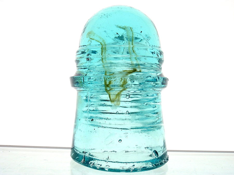 Bright blue aqua with that KILLER milky olive swirls. CD 105 base embossed AM INS CO PAT SEP 13 1881. Far better condition than most of these. Tiny open skirt edge bubble next to a even smaller open base bubble, 5/8" x 1/4" crown flake, three pencil lead ticks on the lower wire ridge and a 1.25" rough area on the lower wire ridge. $ 355.00 includes shipping. Let's try $ 285.00 shipped to you. |