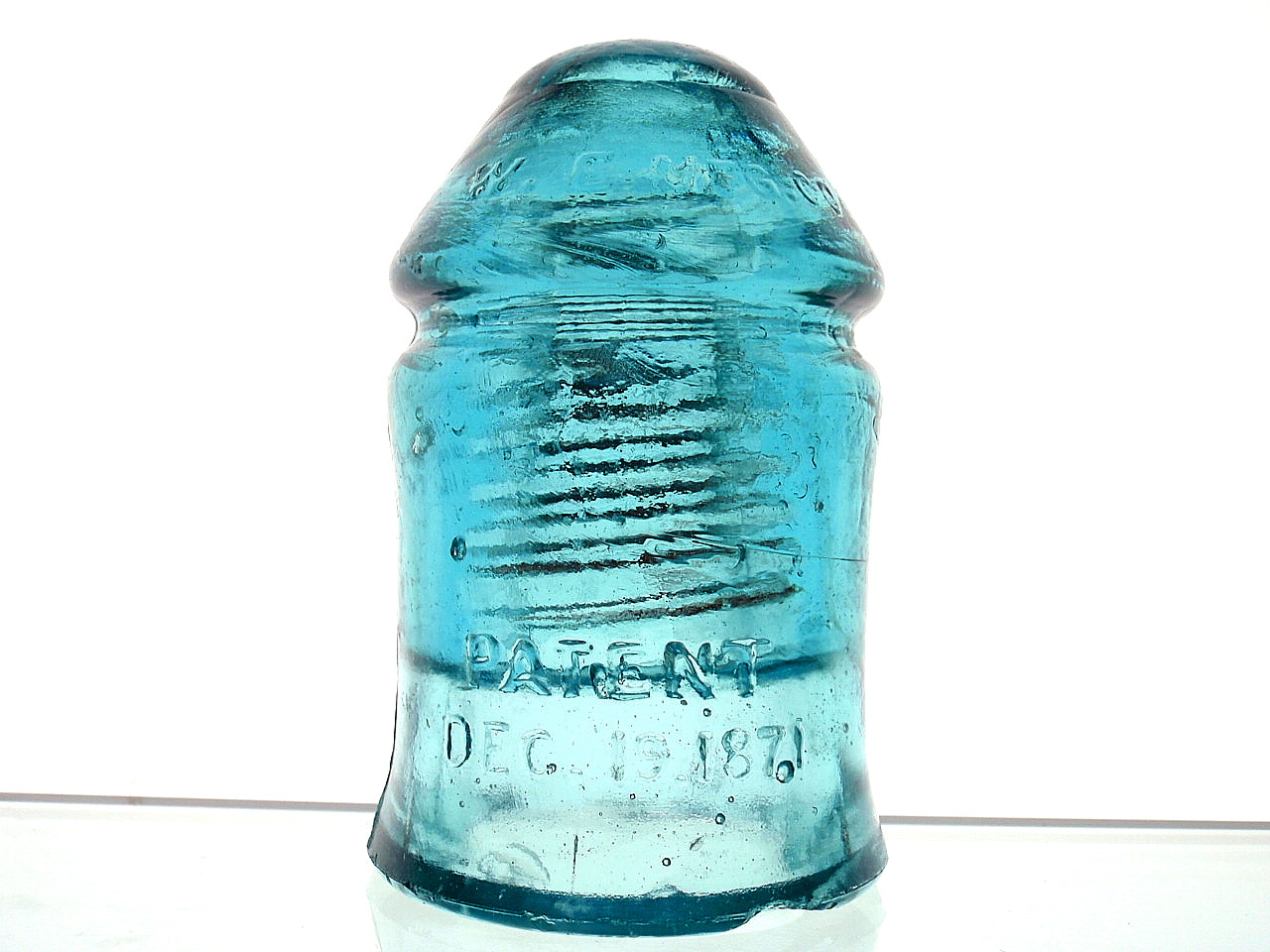 This is the almost Cornflower blue color. Light milkiness throughout gives it a slight jade look to it. Five pencil lead point ticks, side upper wire ridge pinky nail size peck flake, two skinny 5/16" base flakes, rear base 1.0" flake and a 3.0" flake is the damage report. $ 110.00 includes shipping. |